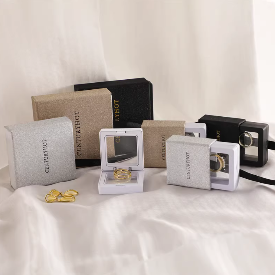 Golden Glitter Stickers Transparent PE display box, floating jewelry box for rings, bracelets, and necklaces, with pull-out ribbon.