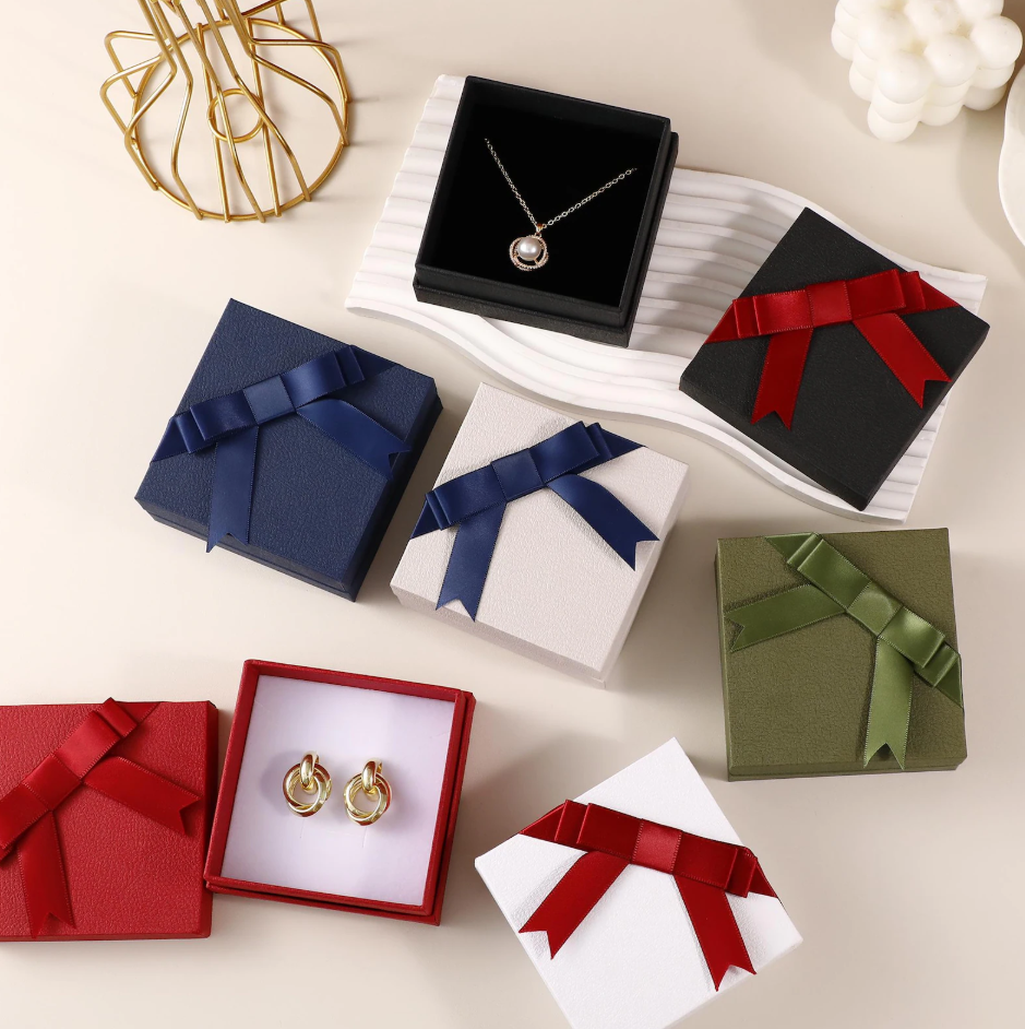 PUPPYSEW 9.5 * 9.5 * 3.5cm Textured Ribbon Gift Box Custom Necklace Box with Microfiber Bag Jewelry Packaging Paper Box with Sponge Personalized Logo