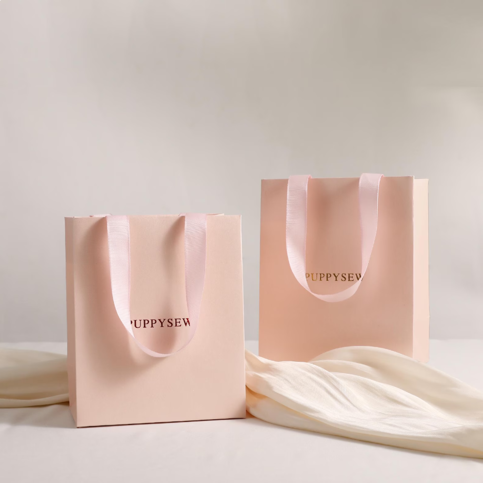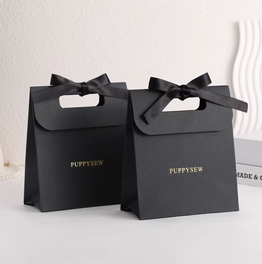 PUPPYSEW Paper bags with flaps, tote bags, gift bags, and cosmetic bags are available with custom logo printing.